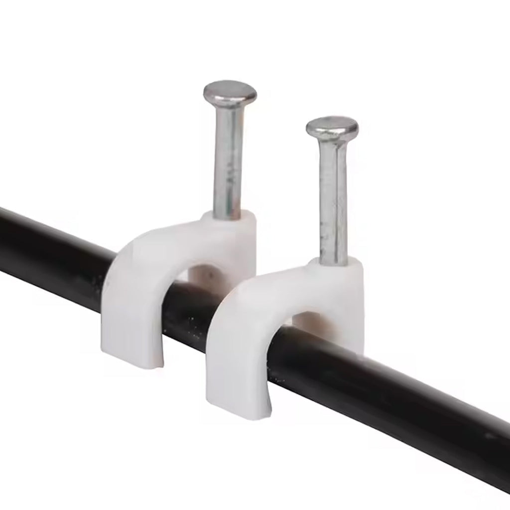 Ensure neat and safe cable management with this 50-piece set of 8mm Nail Cable Clips. Designed with a sturdy plastic U-shaped holder and a pre-inserted steel nail, these clips are ideal for securing electrical wires, coaxial cables, LAN cords, and other round cables to walls or surfaces. The durable design holds cables firmly in place while preventing tangles and trip hazards.