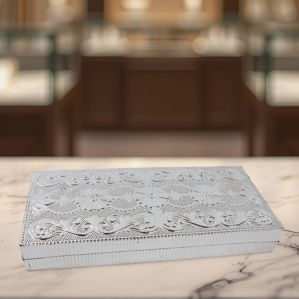 jewelry storage box , multipurpose storage case , angle box , ring holder box , necklace organizer , festival gift packing box , puja room storage , gift packaging box , silver embossed box , rectangle silver case , ornamental craft box