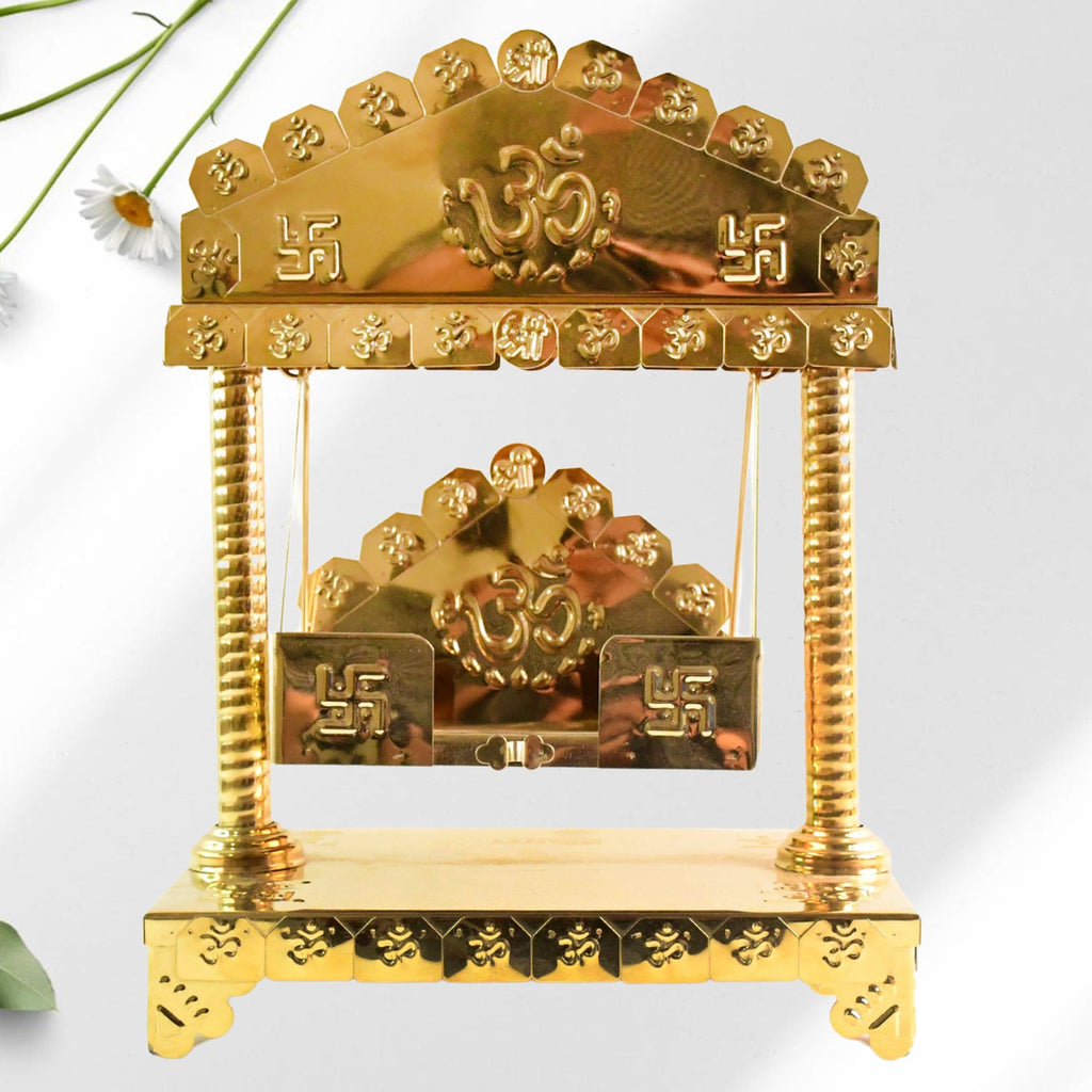 Traditional Brass-Coated Decorative Mini Jhula (Swing) for God Idol – 2 Pc Ornamental Pooja Mandir Accessory with Om & Swastik Engraving